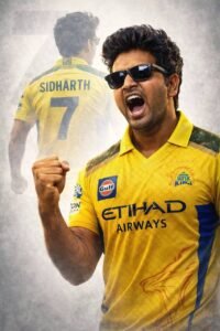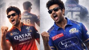 A high-quality sports poster featuring a slim-fit stylish handsome young Indian man (reference- uploaded photo) with quiff-style tousled mid-length black hair, Rectangular black sunglasses. He is wearing a Royal Challengers Bangalore (RCB) cricket jersey in navy blue and red, with official RCB branding and sponsor logos (use uploaded jersey). The image uses a double exposure effect: in the foreground, he is shouting in a triumphant celebration with a clenched fist; in the